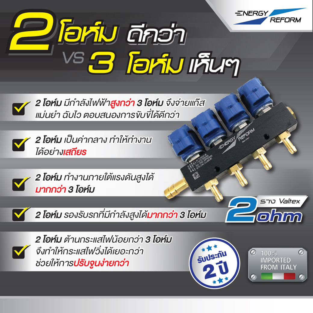 - 2 โอห์ม มีกำลังไฟฟ้าสูงกว่า 3 โอห์ม จึงจ่ายแก๊สแม่นยำ ฉับไว ตอบสนองการขับขี่ได้ดีกว่า